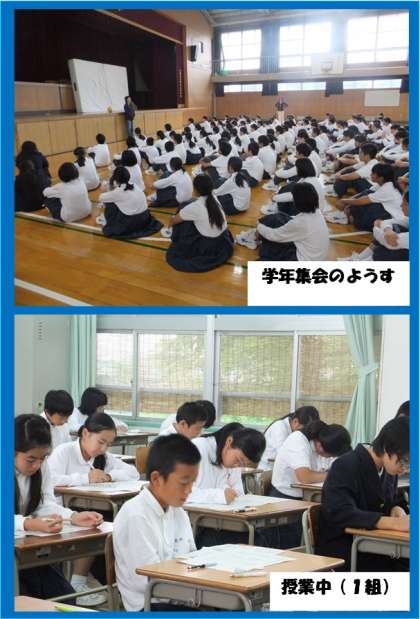 10月14日(金)、早速、中間テストの返却が行われました。普段から努力を積み重ねて、テスト前もしっかり準備(勉強)して受けた人は、テスト返却を楽しみに待っている感じでしたが、残念ながら、2学期に入って勉強をサボり気味で、テストの結果を見るのが辛い人が多かったのでは…?平均点も、どのクラスも1学期より低くなっていました(数学)。休み時間には、廊下で友だちと「今回は最悪や〜」と大きな声を出している人もいました。5時間目の特活は、体育館で学年集会を行いました。初めに竹島先生より文化祭の説明があり、続いて櫻井先生より標準服の正しい着方について、神近先生より中間テストを終えての反省、最後に先生から2つほど注意を入れました。少し集会の時間が長くなりましたが、掃除&終礼を素早く済ませてから下校しました。部活動の人は16時15分より再登校しました。(担当:若月)