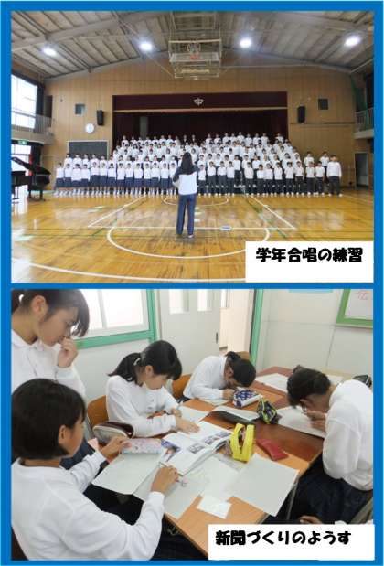 10月17日(月)、登校時間直前まで雨が降っていたので運動場の状態が悪く、全校集会は中止になりました。そのため、朝学活の時間を十分に取ることができたので、2つの話をしました。1つ目は、休み時間のボール使用のルールを守れない人がいたので、1週間ボール使用禁止になったこと。2つ目は、10月21日(金)に行われる漢字検定に向けて、全員合格を目指して頑張ろうという話です。文化祭取り組み強化期間に入ったので、1〜4時間目まで教科の授業があり、5時間目は体育館で学年合唱の練習、6時間目は学級ごとに学級合唱の練習、7時間目は教室と美術室に分かれて、新聞/貼り絵づくりを行いました。初めてだったこともあり、切り替えが大変でしたが、協力して取り組むことができていました。合唱の完成度はまだまだですが、必死で練習して素晴らしいものにしましょう!!(担当:若月)