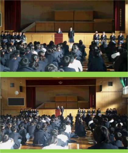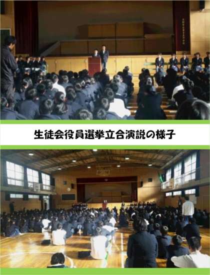 3年生実力テスト、1,2年生の大阪市英語力調査(「英検IBA」)が終った6時間目に生徒会新役員選挙立会演説会が体育館で行われ、会長1名・2年執行委員4名・1年執行委員が2名が選出されます。