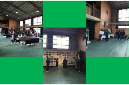 明日の土曜授業において、並行して文化祭展示が体育館をメインに行われます。放課後は、各係や各委員がそれぞれの作品を展示しています。