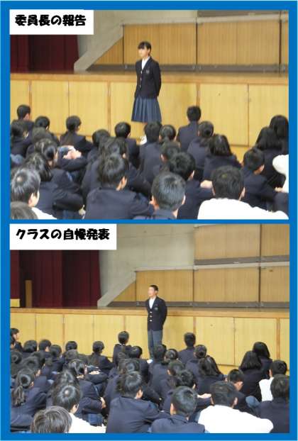11月10日(木)、6時間目に学年集会を行いました。最初に各クラスの委員長から、文化祭後のクラスのようすを報告してもらいました。生徒どうしで注意をできるようになってるがまだ少しうるさくなってしまうことがあるというクラスが多かったですね。反省内容ばかりだったので、次にクラスの自慢できるところを発表してもらいました。『元気で明るいクラス』『欠席者が少なく思いやりのあるクラス』など、なかなか良い意見が出てきました。体育大会、文化祭と取り組む中で、成長した部分はたくさんあります。一方で、学年の課題ある私語については、まだまだ迷惑をかけるときがあります。良いところはドンドン伸ばして、課題を克服していければ、最高の学年をつくっていくことができますね。庄司先生が詳しく教えてくれた防寒着についてのルールも、学年全体で確実に守っていきましょう。(担当:若月)