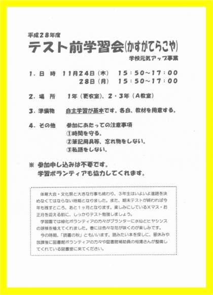 テスト前学習会(かすがてらこや)の案内です。積極的に参加しよう!