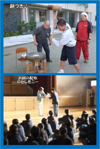 12月7日(水)、朝学活のため、学年の廊下を歩いていると運動場から香ばしい匂いがしていました。(毎年、PTAの方が中心になって、3年生の高校入試合格を祈願して、餅つきを行っています。)ロングレストや体育の授業のために運動場に行った人が交代で手伝っていました。1年生は、初めての経験だったので、先輩のように自然に手伝うのは難しく、4時間目の合同体育のときに、男子→女子の順で餅つきをさせてもらいまいした。餅つきを始めてした人も多かったようで、キャーキャー言いながら、楽しそうに頑張っていました。6時間目は、体育館でお餅の配布のセレモニーが行われ、その後、教室で配られました。残った時間で、期末テストの反省と授業アンケートを行いました。終礼後、部活に行く人も、そのまま下校する人も、嬉しそうにもらったお餅を大切に手に持っていました。(担当:若月)