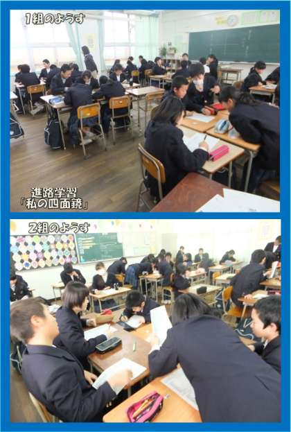 12月9日(金)、今週の通信では、ずっと体調不良による欠席・遅刻・早退について書いていました。クラスによっては欠席者が減ったところもありましたが、反対に授業をしていても欠席者の席が空き過ぎていて寂しくなるようなクラスもありました。冬休みまでには、どのクラスの人も元気いっぱいで登校してくれると嬉しいですね。1〜4時間目まで、教科の授業があり、5時間目の特活は『進路学習(1回目)』を行いました。『進路』というと、高校の進学先を探すのかと勘違いしている人もいましたが、もっと大きく考えて、自分の進んでいく道を探していこうという学習です。まずは、自分の長所(良いところ)を見つけるために、『私の四面鏡(班のメンバーに自分の良いところを見つけてもらい、自分が思っているものと比べてみる)』を行いました。どのクラスでも、非常に良い雰囲気で取り組むことができていました。(担当:若月)