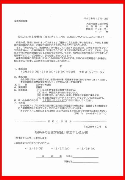 冬休みに行われる自学自習学習会「かすがてらこや」の案内を本日生徒に配付しました。(担当:中井)