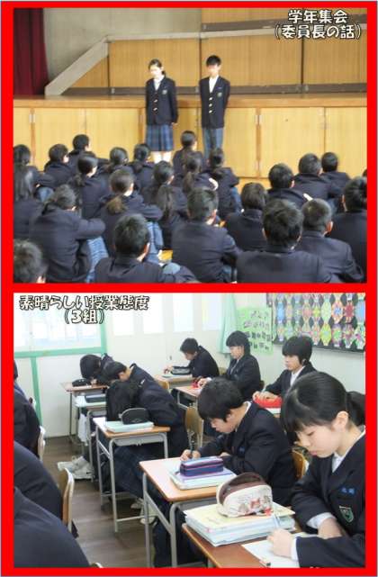 1月13日(金)、今週は週末に向けてドンドン寒さが厳しくなるという予報通り、今日も底冷えする天気でした。朝からエアコンをつけていましたが、休み時間になると廊下に出てきて、「寒い〜寒い〜」と言っている人がたくさんいました。インフルエンザ対策で濡れタオルを自分の机にかける取り組み(湿度を上げる)も定着してきました。授業前のチャイム着席も、3分前には委員会の人を中心に声をかけ合って行うことができてきました。5時間目は体育館で通常通り学年集会を行いましたが、昼休みに運動場で遊んでいた人も、13時15分の予鈴までに体育館前に集合できていました。(指示される前に、次のことを考えて行動できるようになれば、4月から入学してくる新1年生の良き手本となれます。)集会では、委員長の代表から、「給食準備やあいさつなど、2学期より改善していきましょう!!」と話がありました。(担当:若月)
