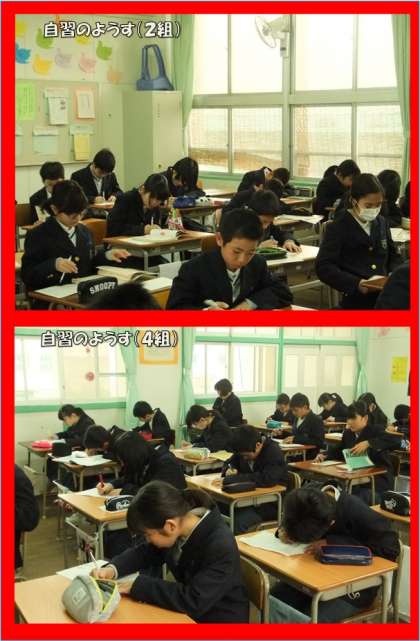 1月20日(金)、今週は毎日、「インフルエンザの流行が止まりますように!!」と願いながら過ごしました。前日、1組の学級休業に続き、2組も体調不良で早退する人が多くいたので、元気になって登校できるか心配していました。まだ、体調不良のままの人もいましたが、インフルエンザで欠席している人の数は増えていませんでした。(それでも、どのクラスも3〜7名ぐらい欠席者がいました。)1・2時間目終了後、3・4時間目は英検を行いました。ほとんどの人は5級を受験しましたが、他の級に挑戦している人もいました。3時間目に筆記試験、4時間目にリスニングテストを、受験する級の設定時間で行いました。テスト前、答案用紙の記入に手間取っていた人もいましたが、無事に終わりました。6時間目は、校内研究授業が行われ、たくさんの先生に見守られながら緊張感を持って頑張っていました。(担当:若月)