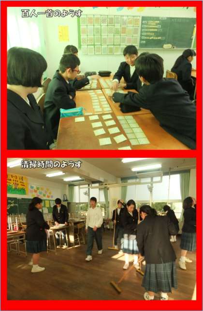 1月25日(水)、天気予報で、「○曜日が寒さのピークでしょう」と聞く度に、「もう暖かくなるかな?」と期待しますが、朝から厳しい冷え込みでした。インフルエンザの大流行ばかり気になっていましたが、この寒さのせいで、風邪による熱で休んでいる人も増えてきました。2組に授業に行きましたが、空席が目立ち、寂しい感じがしました。6時間目には、『百人一首大会』が行われる予定でしたが、厳しい寒さの中で、体育館の冷たい床の上に長時間座りこんでいるだけで、体調を崩してしまう人がでてきそうなので、延期にしました。(2月・3月に空き時間があれば行います。)その代わりに、クラス毎に『クラス百人一首大会』を行いました。1班5〜6人でかるたを取り合いましたが、どのクラスも「キャーキャー」言いながら、大いに盛り上がっていました。来年は上の句を聞いただけで取れる人が増えて欲しいですね。(担当:若月)