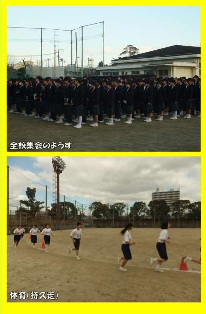 1月31日(火)、朝から厳しい寒さでしたが、延期になっていた全校集会が行われました。集会では、校長先生と永澤先生から話がありました。寒い中でしたが、最後までしっかりした態度で話を聞くことができていました。(様々な場面で、静かに集中して話を聞ける力がついてきていることを感じます。人の話をしっかり聞けることは、非常に大切な能力ですよ。)昼からの授業は、午前中の体育の持久走がしんどかったのか、少し疲れた表情をしている人が多かったように感じました。それでも、1組は7時間目の授業(国語)を前向きにしっかり頑張れていました。(昨日の数学の授業も含めて、7時間目まで頑張りぬける1組のパワーに感心しています。)他のクラスの人も1組の頑張りに刺激を受けて1つ1つの授業を今まで以上に前向きに受けてみてください。学年末テストまで、あと1ヶ月しかありませんからね。(担当:若月)