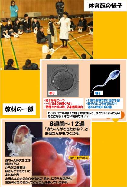 月曜の1回目の授業では、卵子と精子が出会う「受精」そして「妊娠」、「胎児の成長過程」、「出産」について、図や写真を見ながらの授業でした。ひとりひとりのいのちが、いかに特別で、大事にされて、お腹の中から赤ちゃんの時、そして今も育てられているのか、それぞれが感じてくれていたようです。