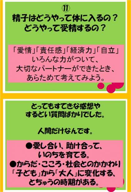 また、前回の授業後に出てきた質問に答える時間も設けました。「双子はなぜできるの?」「へその緒の長さは?」といったものから「精子と卵子はどうやって出会うの?」という質問もありました。性について話をするのは大変デリケートなことが多く、難しいものです。本校では「自分はもちろん、他のひとの こころ・からだ・いのち を大切に」の思いを一貫し、3学年それぞれの段階に応じた性に関する学習を展開しています。