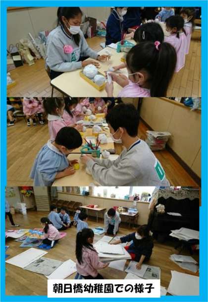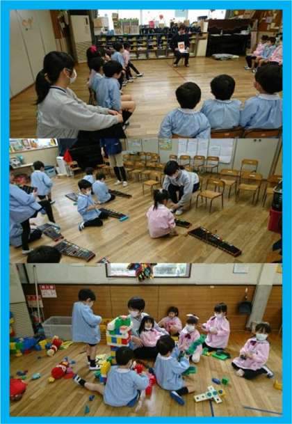 年少組の二人は工作をしています。年長組では英語の授業を一緒に受けたり、楽器演奏の練習の補助をしたりしていました。また、自由遊びの年中組、子どもたちにモテモテです。(担当:奥田)