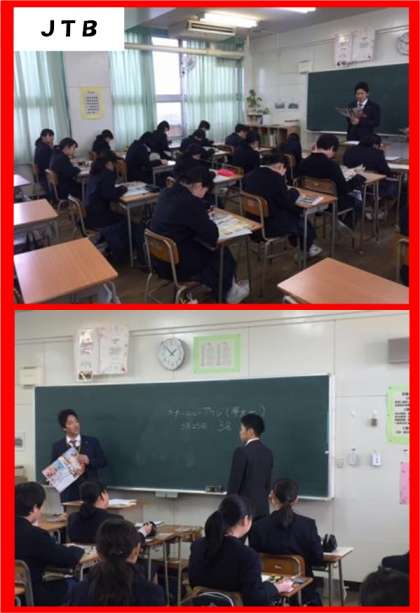 旅行業のグループではJTBの方にお話を伺いました。仕事の内容、やりがい、失敗談などをお話し頂いた後、パンフレットを使い、クイズを行いました。