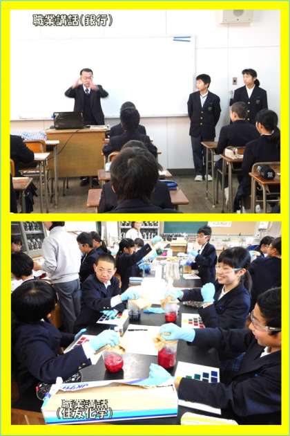 2月10日(金)、私立高校の入試の日でした。学校に来る途中に数人の3年生と出会いましたが、みんな緊張した顔をしていました。あと、たった2年後に、みんなも同じように緊張しながら受験に行かないといけません。「先生によって授業態度を変えないこと」なんて注意されなくても、2年後のことを考えれば、真剣に受けるべきですね。2・3・4組で数学の授業があったので、少しだけ入試の話をしましたが、必要以上に心配しなくてもかまいません。今できること(1年生で習ったことを復習して2年生になる。)をしっかり積み重ねていけば、進路は開かれます。日々の授業を大切にしながら頑張っていきましょう。5時間目には、「職業講話」が行われました。様々な企業の方が、忙しい中、みんなのために話をしに来てくれました。どのグループの人も真剣に取り組めていたので良かったと思います。(担当:若月)
