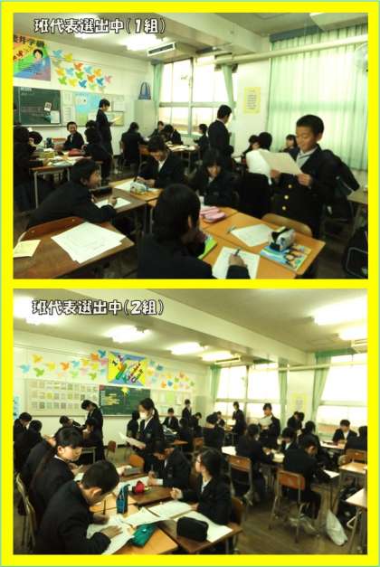 2月22日(水)、学年末テスト1週間前に入り、学年の雰囲気がピリッとしてくれるかな!?と期待して授業に行きました。数学ではテスト対策授業を行っていますが、その日にやるべきプリントが終わった人から、テストに向けての提出物を積極的に取り組んでいました。素晴らしい集中力で、中学1年生とは思えないレベルでした。他の教科でもテストに向けての学習が始まっていきます。数学だけでなく、すべての教科を前向きな姿勢で頑張ってください。6時間目は、3月18日(土)の土曜授業で行われる『弁論大会』の学年代表(3名)を決めるためのクラス代表(3名)を選びました。まずは班の中で全員が発表し、班メンバーどうしで採点し、班代表を決めて、次に班代表の人がクラス全員の前で発表し、投票でクラス代表を決定しました。選ばれた人たちは、学年代表に選ばれるように頑張ってくださいね。(担当:若月)
