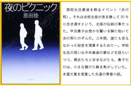 芥川賞の山下澄人さんの本は残念ながら図書室になかったのですが、恩田さんの本はたくさんあったので、ご紹介します。読んだことのない人は、是非読んでみてね。(担当:奥田)