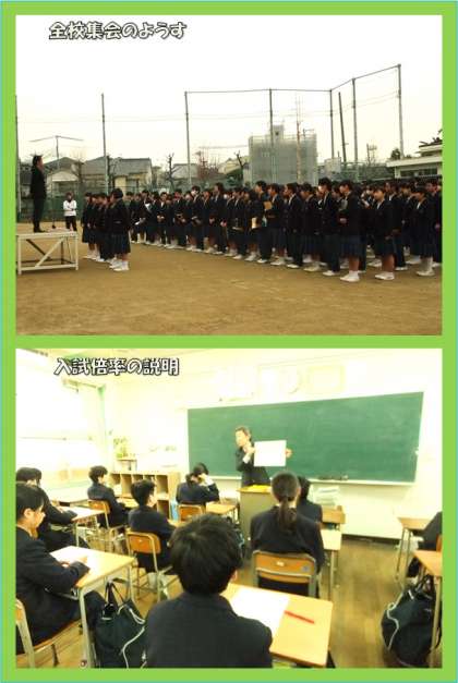 3月6日(月)、全校集会が行われました。学年末テストが終わり、気が抜けてしまって集合状態が悪くならないか心配していましたが、いつも通り8時15分には整列・点呼完了できていました。(良い習慣が身についていくことは喜ばしいことですね。)授業では、テスト返却が行われました。期待通りの結果が返ってきた人と、そうでない人がいました。「点数だけに一喜一憂してはいけない!!」と言っても、やはり得点が気になるのはしょうがないと思いますが、『テスト直し』だけは前向きに取り組んでください。間違った問題は、自分が分かっていない内容のはずですから、『テスト直し』で復習すれば、間違いなく実力アップにつながります。修了式まで3週間弱ありますが、ダラダラ過ごすのではなく、『1年生の学習内容の総復習』を必死で頑張りましょう。4月から自信を持って2年生になりたいですね。(担当:若月)