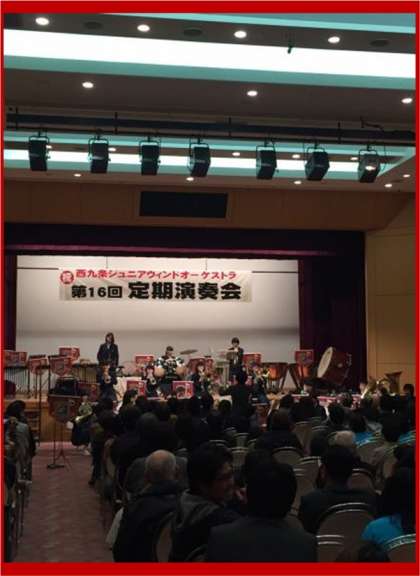 本校の吹奏楽部が、本日、西九条小学校ジュニアウインドオーケストラ定期演奏会に出演しました。演奏会の第二部に出演させていただき、テレビCMメドレーと、パラダイス・ハズ・ノーボーダーの二曲を演奏しました。