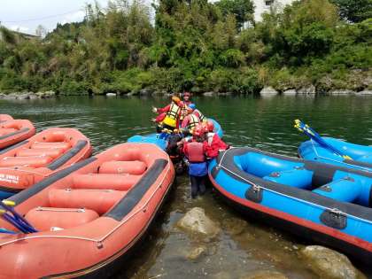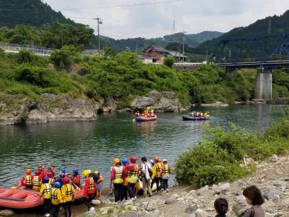 修学旅行、1日目の活動が始まりました。まずはじめにラフティング(ゴムボートでの川下り)になります。