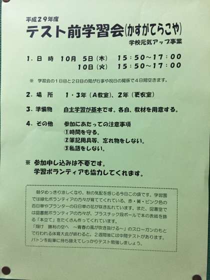 中間テストに向けてのかすがてらこやが始まります。ぜひ参加してください。
