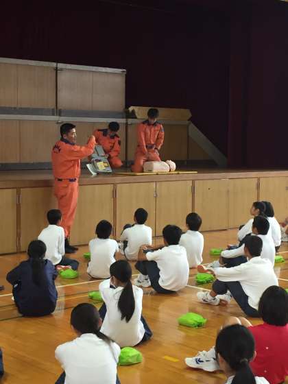 二つに分かれて、応急処置訓練(AEDを使用した心肺蘇生法)と簡易担架作成訓練を行いました。