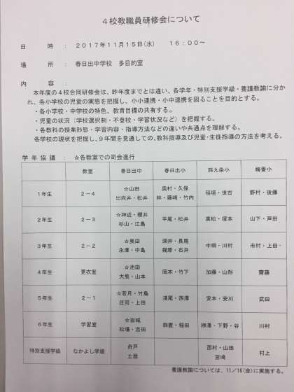 西九条小学校・春日出小学校・梅香小学校・春日出中学校の教職員が、各1〜6年生と特別支援学級で7つに別れ、研修を行いました。研修の内容は、学校選択制・学習状況・分割授業・T.T.・服装・学校生活について話し合いました。