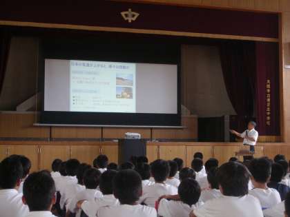 大塚製薬株式会社の吉岡弘文さんにご講演いただきました。熱中症を予防するための生活の仕方や、水分、栄養分の摂り方を学びました。暑い夏の部活動で、安全に健康に過ごせるよう努力したいです。