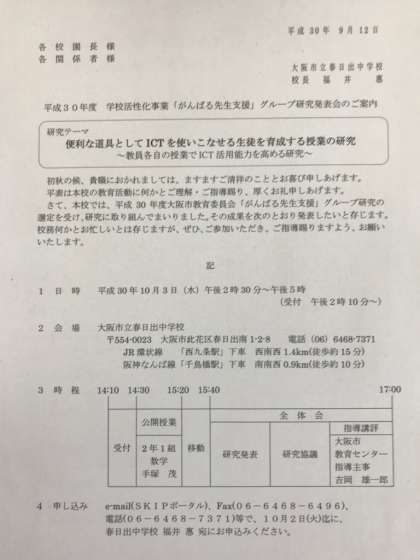 本校において本日、平成30年度 学校活性化事業 「がんばる先生支援」グループ研究発表会が実施されます。