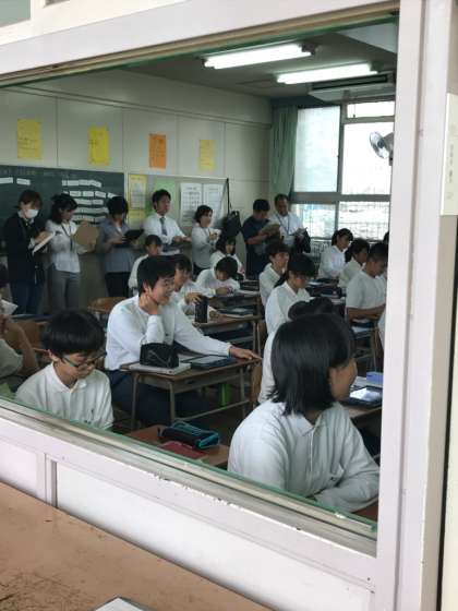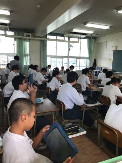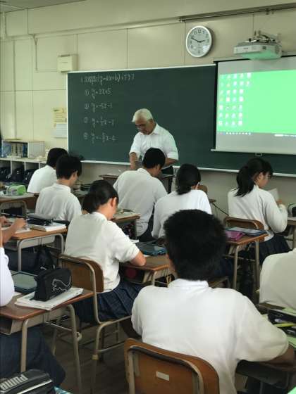 1次関数のグラフの学習で、一人1台のタブレットを操作しながらデジタル教材を使用して授業を行いました。1次関数(y=ax+b)のグラフを描かせ、グラフの変化がわかり易く説明されていました。