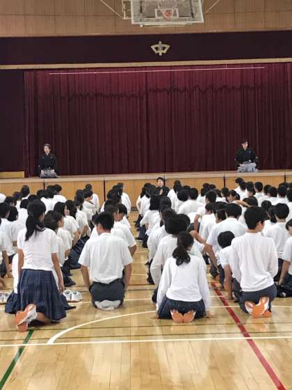 山本能楽堂から3人の講師が来校され、まずは狂言について簡単に解説を受け、その後、「柿山伏」を鑑賞しました。