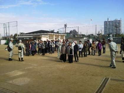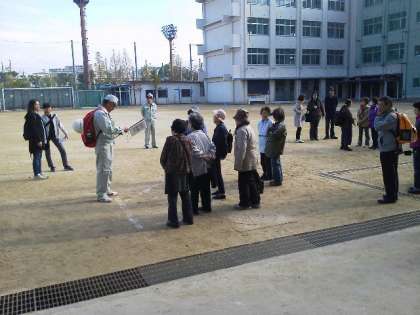 整列点呼・安否確認の後、平日の日中を想定しての訓練でしたので、学校は生徒がいるからと、想定避難所の「クレーネ大阪」まで、隊を成して整然と移動して行かれました。