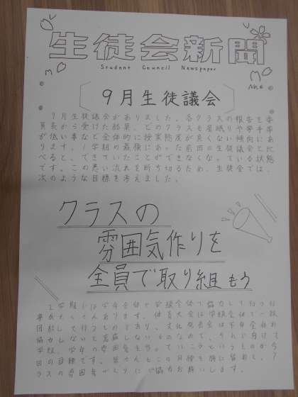 9月の生徒議会で決まったことの報告です。目標に向かって全員で取り組みましょう。