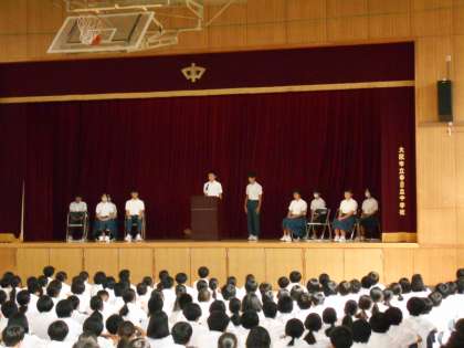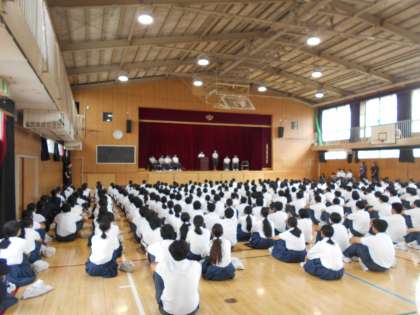 生徒会立合演説会が体育館で行われました。生徒会執行部として6名が立候補しており、すべての人が新任投票ということになりました。春日出中学校を良くしたいという思いや寄り添っていきたい、また改革を進めたいなどのこれからの未来に向かっての決意を演説してくれていました。その後、投票が行われた結果、全員が後期の生徒会執行部に選出されました。がんばって自治がとれる学校にしていきましょう。