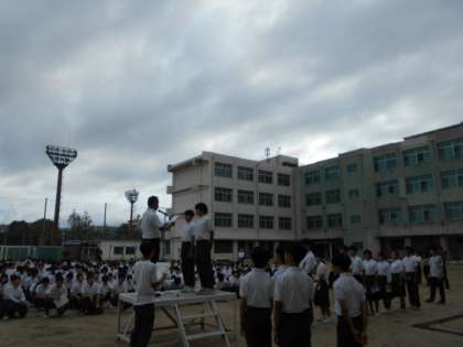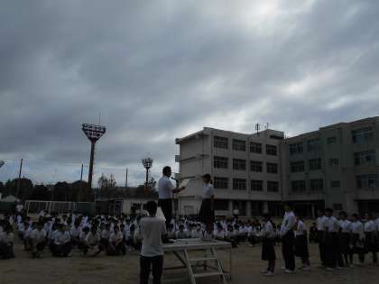 少し蒸し暑い中、全校集会が行われました。生徒会の認証式が行われ、その後、前期生徒会長からのあいさつ、後期生徒会長からのあいさつがありました。体育大会までは前期生徒会を中心に運営してもらうことになります。最後まで頑張ってくださいね。今日は、ダンス部、吹奏楽部、バドミントン部、各学年のピカピカ週間の優秀クラスの表彰がありました。