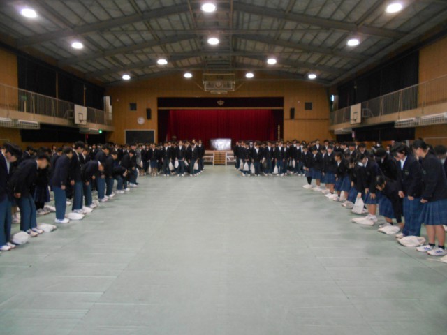 本日の4限目に送別の式が行われました。今週の金曜日に卒業式がありますが、式には会場の関係で式には出ることができないので送別の式が毎年実施されています。生徒会が司会進行で、新旧生徒会長による校旗の受け渡し、在校生からのお祝いの言葉、卒業生から在校生へのメッセージがありました。また、在校生からはエールとして校歌が卒業生に向かって合唱、卒業生はお返しとして「3月9日」を熱唱してくれました。3年生にとっての残り5日になってしまいました。公立入試もあり、本当のラストスパートですね。