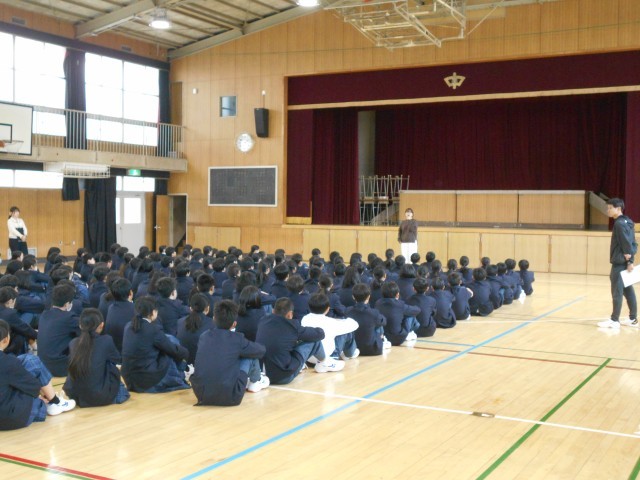 また、学年集会では教科担任の先生や学級担任の先生の自己紹介、挨拶の仕方、学年目標・スローガンなどが紹介されたり、各先生方の思いや学校生活におけるルール等が共有されていました。
