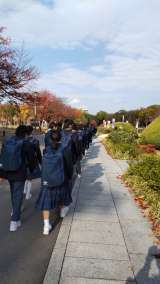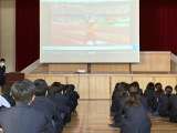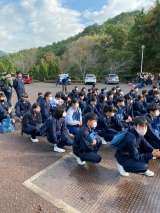 ほぼ予定通りの時刻に帰校しました。代表生徒のふりかえり挨拶の場面。