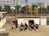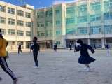 1年生体育:5時間目はじまりました。普段、校舎窓を覆っている防球ネットが空調工事...