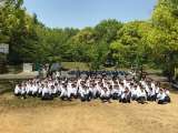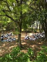 日差しが強すぎるので近くの木陰で食べています。みんな楽しそうです。