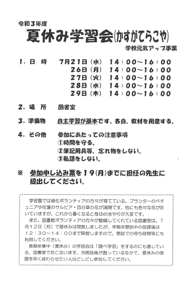 学校元気アップの学習ボランティアさんによる夏休み学習会を実施します。 テレビやゲ...