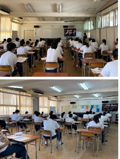 3年生音楽の授業。鑑賞の後、距離をとってリコーダーです。美しいハーモニーが廊下階...