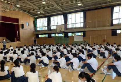 体育館での学年集会。 9月初めに実施する一泊移住についての説明を聞いています。持...