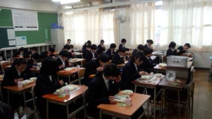 さて、1年生にとっては中学校での給食、小学校とは一味違う雰囲気の中で、給食をいただいていることでしょう。栄養バランス、栄養価を考えて提供していただく学校給食を感謝の気持ちでいただきましょう。