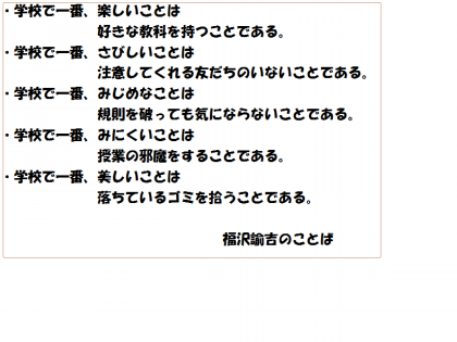 さて、今朝の朝会では校長先生から学校生活についてのお話がありました。内容は、福沢諭吉先生が学校を作った時に学生に語ったことばでした。