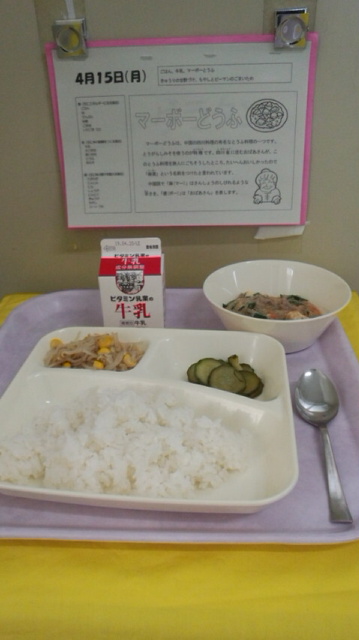 マーボーどうふ きゅうりの甘酢づけ もやしとコーンのごまいため ごはん 牛乳