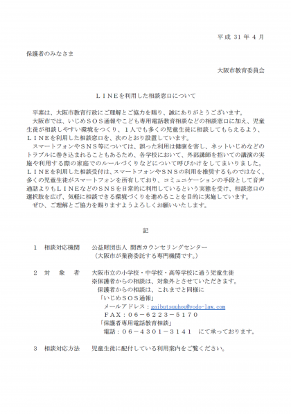 LINEを利用した相談窓口利用案内について大阪市教育委員会より通知がありましたのでお知らせいたします。