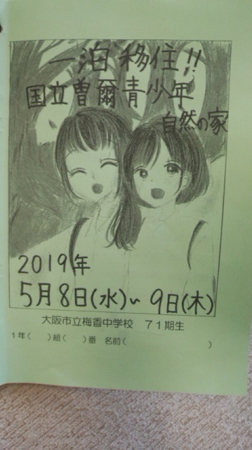 さて、1年生は明日5月8日から一泊移住が実施されます。行き先は、奈良にある国立曽爾青少年自然の家です。目的は、「恵まれた自然環境の中で規律ある集団活動を養うとともに、友人と豊かな人間関係を形成し、様々な活動を通じて協力し合う心を育てる」です。ぜひしっかりと活動してきてほしいものです。1年生の皆さんは明朝はいつもより早い登校になりますので気を付けましょう。午前7時45分体育館に荷物を持って集合です。健康チェック、出発式を行い、8時30分バスで出発予定です。