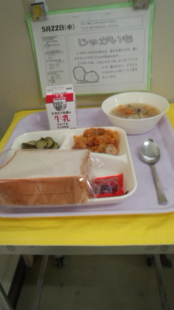 じゃがいものミートグラタン スープ きゅうりのピクルス いちごジャム パン 牛乳