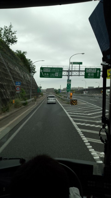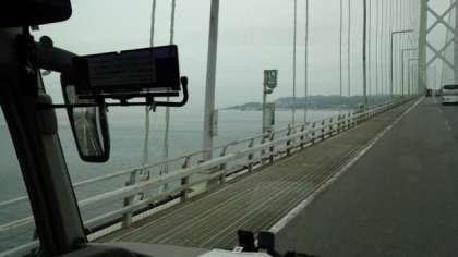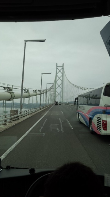 バスは第2神明道路から神戸淡路道へ、淡路海峡大橋通過中です。橋は平成10年に完成で長さ4㎞だって、凄い。