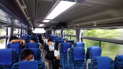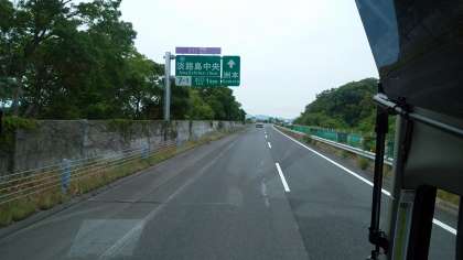 淡路サービスエリアを出発して、次の休憩場所まで1時間45分くらいバスの車内ではレク係が作った音楽を楽しんでいます。ここで質問です。淡路島の大きさは琵琶湖より大きい、それとも小さい。さあ、どっちだと思います。ヒントは淡路島の面積はおよそ590k?です。